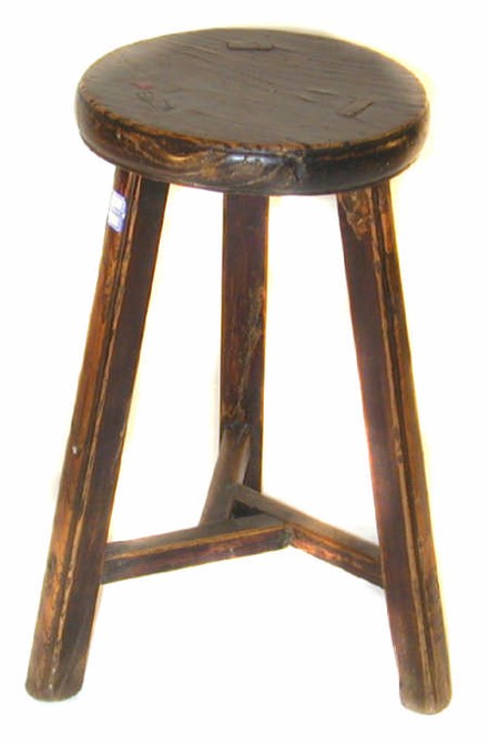 Description: Provincial Chinese Elm Stool/ Stand Circa 1860 round top raised on three legs connected with stretchers.