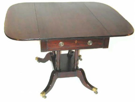 rectangular top with a pair of D shaped drops over a one drawer freize and raised on a pedestal with four turned columns over a molded base with four cabriole style legs ending in brass casters.