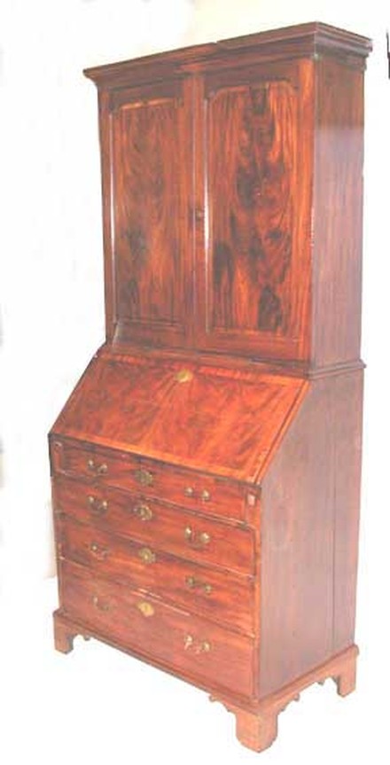 Description: George III Mahogany Bureau Bookcase, Circa 1780 and later; molded cornice over a pair of panelled doors; the base with a fitted interior and secret compartments over four graduated drawers; raised on bracket feet.