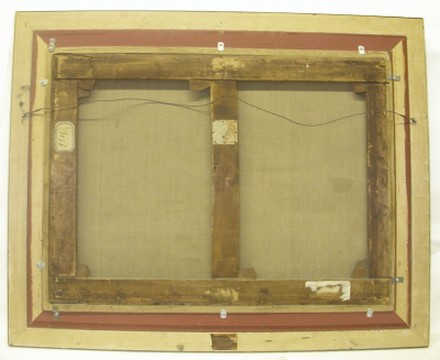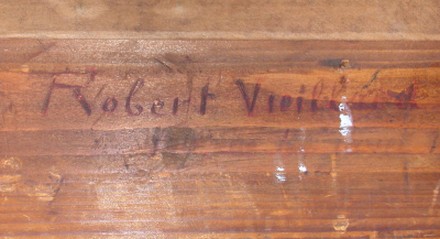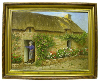 Description: Robert Veiellard, French School, 19th Century, Oil on Canvas in a parcel gilt frame depicting a rural scene with a woman standing in the door of a house. Signed lower right and on the stretcher.