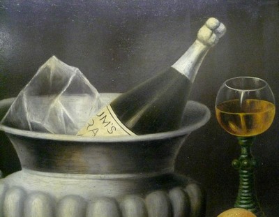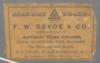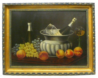 Description: American School (19th Century) Oil on Artists Board; depicting a table top still life with champagne in a cooler, grapes, peaches and a wine glass in the renaissance revival style. Labeled on reverse: Academy Board/ Trade Mark/ F. W. Devoe & Co/ Manufactureres of/ Artists' Tube Colors/ Canvas, Oil-Sketching Paper, Millboards... Fulton and Williams Streets New York.