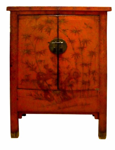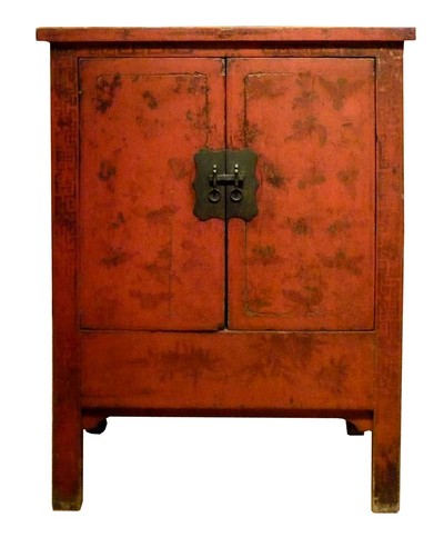 Description: Ming Dynasty Style Red Lacquered Cabinet, Circa 1860; Shanxi Province, rectangular top over a pair of doors and raised on stile legs. One has a slightly dished top.