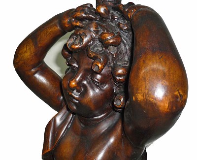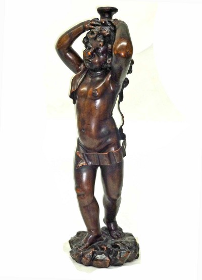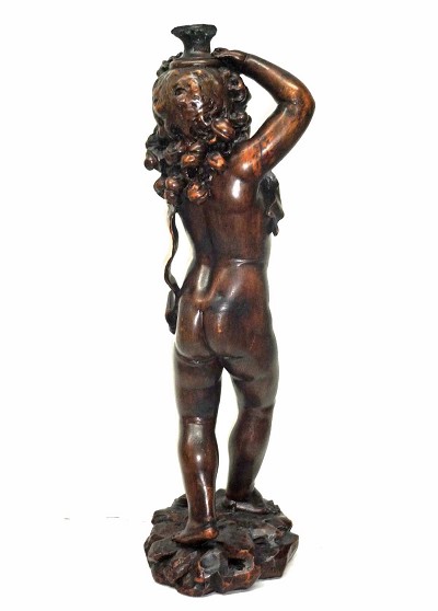 Description: Italian Carved Fruitwood Sculpture, 18th Century; depicting a cherub holding a socle with a reticulated ribbon wrapping figure which stands on a rock-work base.