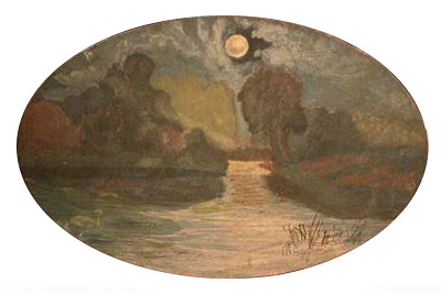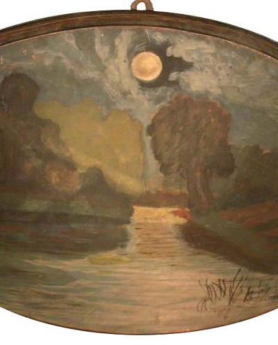 Description: American Arts and Crafts Style Oil on Board, Circa 1915; depicting a moonlit landscape with a meandering stream.
