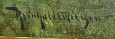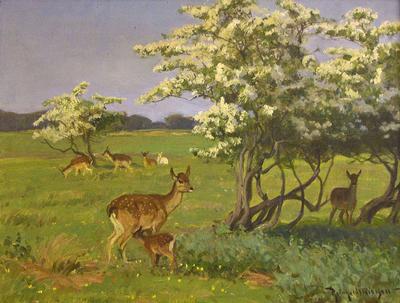 Description: Knud Reinhold Nielsen (Danish 1891-1984) Oil on Canvas, Signed lower right, depicting deer in a garden in Copenhagen.