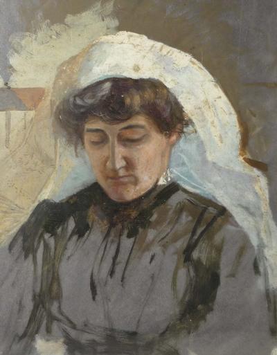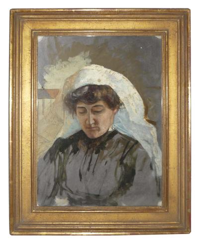 Description: A.H.BERENS (English Active C. 1910) Oil on Paper depicting a woman in a white head scarf. Framed.