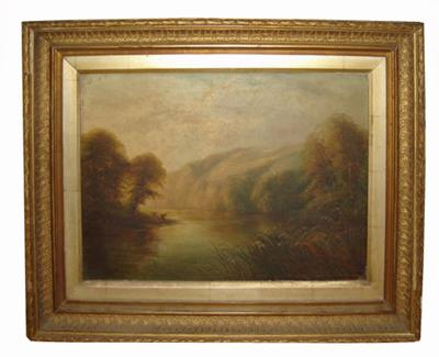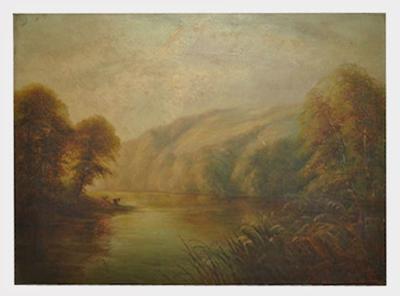 Description: French School (19th Century) Oil on Canvas, Circa 1850; signed lower right, depicting a hazy summer evening along a European River with cattle along the bank.