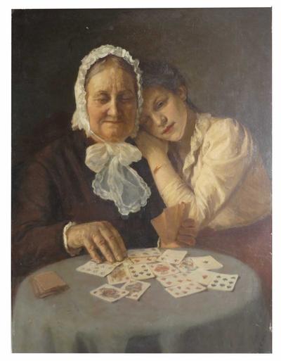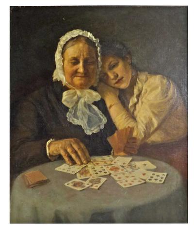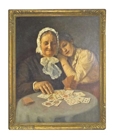 Description: European School Oil on Canvas Circa 1900 depicting a domestic portrait of an elderly woman seated and playing cards at a table with a younger loved one looking on. Framed.