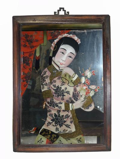 Description: Chinese Export Eglomise Mirrored Panel, Circa 1850; depicting a woman in an interior with flowers; framed.