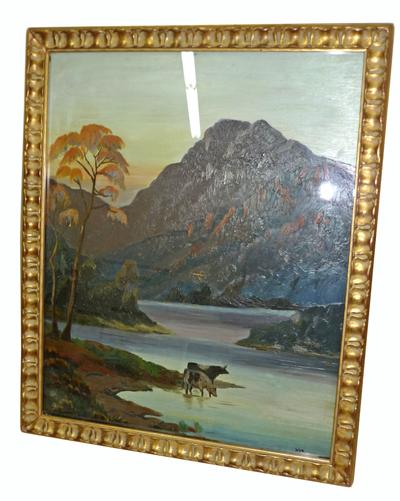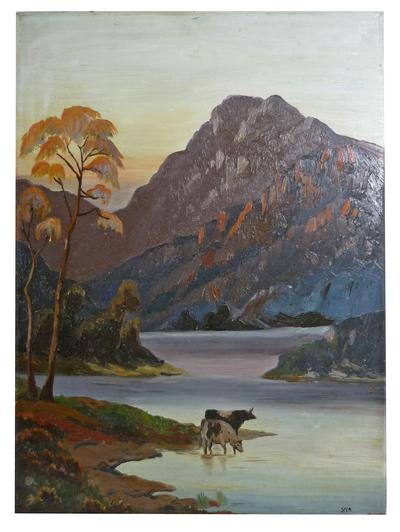 Description: European School Oil on Panel, Circa 1900; initialed lower right: Y.M. Depicting an exotic landscape with cows wading in a river below a mountain. Framed.