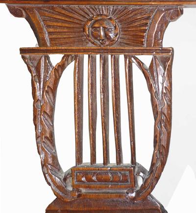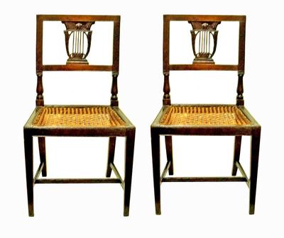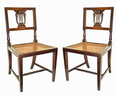 Description: Pair of Northern Italian Carved Walnut Side Chairs, 18th Century; featuring a reticulated Lyre shaped splat below a carved rendition of Apollo emanating rays of light; raised on a base with a caned seat over square tapering legs connected with stretchers.