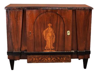 Description: European Neoclassical Style Inlaid Side Cabinet, Circa 1900; rectangular top over an inlaid door flanked with columns; on an inlaid apron and raised with ebonized tapering feet.