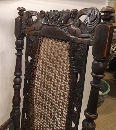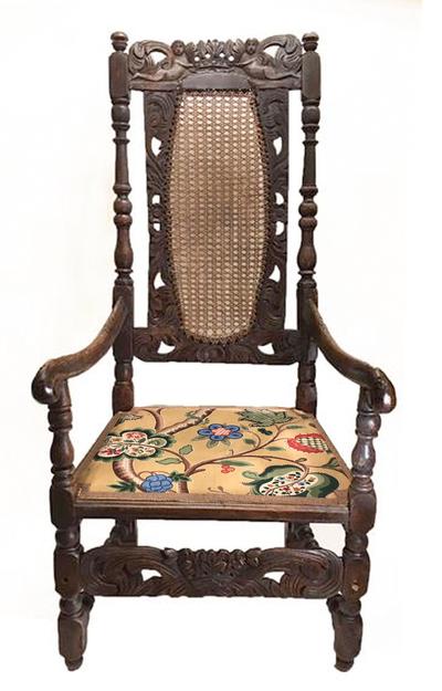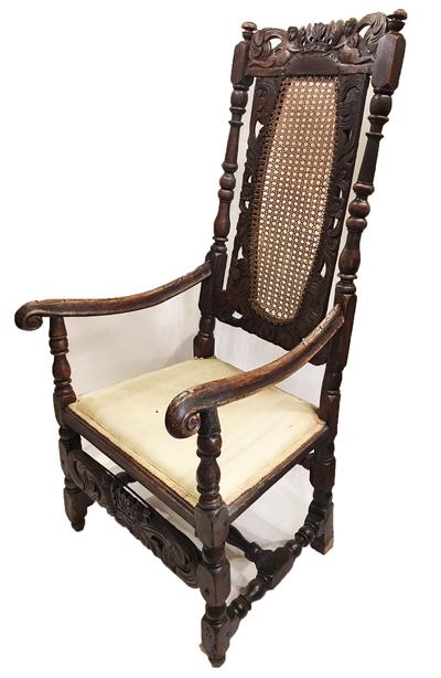 Description: Charles II Carved Walnut Arm Chair, Circa 1660; the back with a carved crown held by cherubs flanked with turned sides; the arms, legs, and stretchers with similar carvings and related turnings. Great example of an early English Chair.