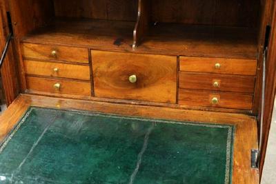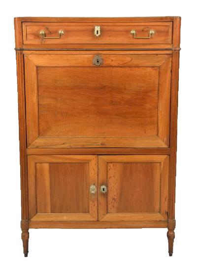 Description: Louis XVI French Provincial Walnut Secrétaire à Abattant, Circa 1820; featuring a freize drawer over a fall front revealing a fitted interior with a leather lined writing surface, over cabinet doors and raised on tapering and fluted legs.