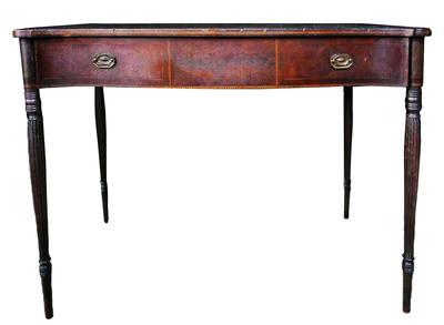 Description: American Federal Period Inlaid Mahogany Serving Table, Circa 1800; Shaped top over an inlaid drawer; raised on fluted and tapering legs.