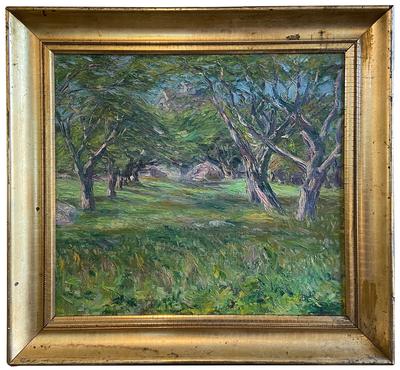 Summer Landscape with Trees. Oil on canvas, indistinctive signature on the right under the tree; inscribed on the canvas top edge 'Sold to Al Renick'. Framed.