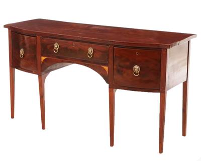 Description: English Regency Period Sideboard, Circa 1820; Bow front over central drawer flanked with cellarette drawers; on a shaped apron with square tapering legs.