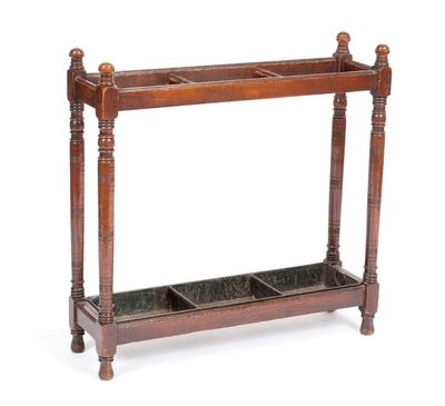 Description: English Oak Umbrella Stand, Circa 1850. Turned supports with three-compartments and metal insert drip pan. Provenance: Henry Stern Antiques, New Orleans, LA.