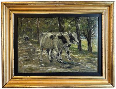 Description: Danish Oil on Canvas, Circa 1920; depicting Cattle walking through a tree lined path. Framed. Signed indistinctly lower right.
