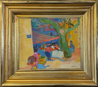 Description: Daniel Couthures (French B 1930) Oil on Canvas in a gilded frame depicting figures in the market at Saint Maxime in the South of France. Signed lower right 'Couthures' and titled verso 'St. Maxime le Marche au Plantane'