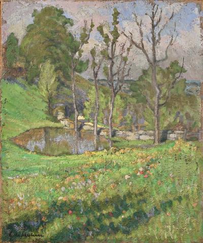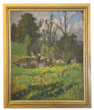 Description: Étienne De Martenne (French 1867-1920) Oil on Canvas Signed Lower Left: 'E De Martenne'. Depicting a summer landscape featuring lake and wildflowers.